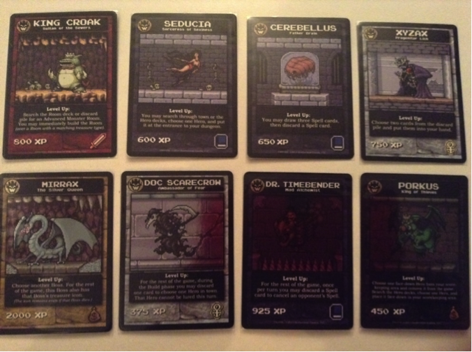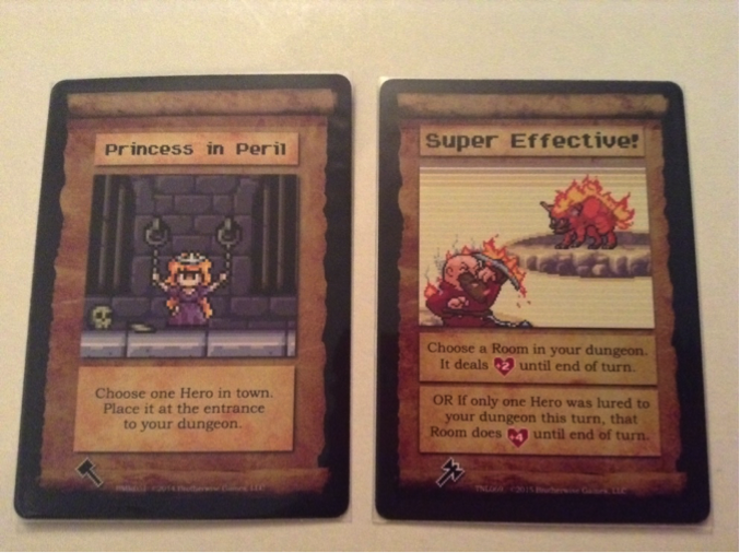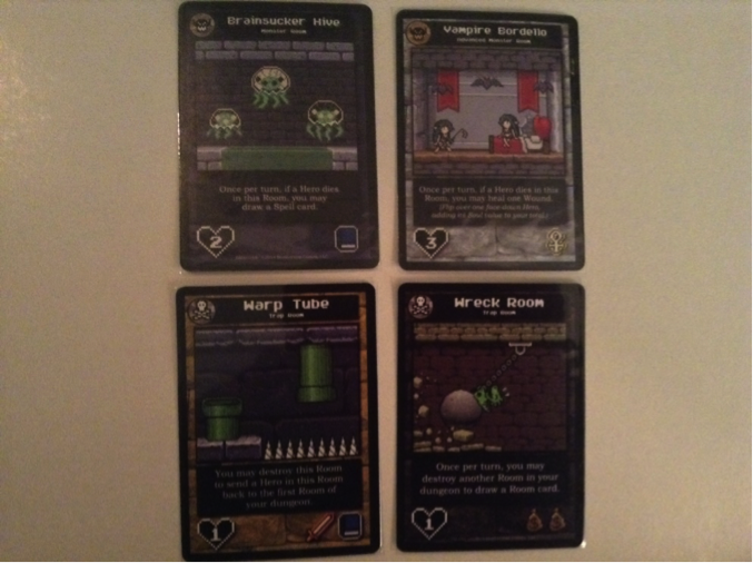 Room cards are sometimes super distracting because you want to check out the fun, sometimes familiar, art and reminisce about the various video game tropes and direct references. There are two different types of Room cards: Monster Rooms and Trap Rooms. Each room has a Damage counter that is inflicted on any hero that enters the room. Each card has a Treasure icon that designates which types of heroes will be attracted to your dungeon. Rooms are built once per turn to the left of your Boss card. Standard Room cards can be built on any other room card or to the left until you hit the maximum of 5 rooms. Advanced Room cards can only be built on cards that share at least one Treasure Icon. This makes for some fun strategy and allows you to create heavier hitting rooms to kill the stronger heroes that you face later in the game. Some Rooms even offer special abilities if the hero dies in that room, such as allowing the player to draw more spell cards. Boss card are usually based on typical gaming enemies or depict rooms filled with hoards of monsters. Trap rooms are a bit more familiar and are stylized after obstacles in video games, such as a warp tube that leads to a spike pit. When will heroes learn that you just can’t go down every tube?! The heaviest use of random pop culture references appear in the room cards, so they tend to get a lot of laughs.