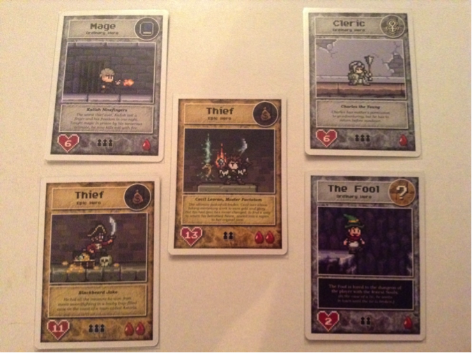 The Hero cards are some of my favorite in the game. These are the cards that you want to attract to your dungeon to slaughter. Every hero has its own lore section that describes that hero, has no gameplay value at all, and is typically just fun little quotes and anecdotes. Hero cards will tell you which type of character the hero is, which corresponds to the Treasure type that hero is attracted to. These Treasure icons will match up with the Treasure Icons on your Room cards, so the player with most matching icons gets to have that hero venture their devious lair. If you kill the hero in your dungeon you claim the card’s Soul, however, if the hero makes it to your Boss card with some HP he inflicts a Wound. The game is won when a player ends their turn with 10 souls. A player loses, or “dies”, when they have 5 wounds. I’m a big fan of flavor text, maybe stemming from my love of Pokémon, so I always look for fun additions just for the sake of immersion or humor. This is why Hero cards are some of the best whether it’s Charles the Young, who has his mother’s approval to go adventuring but needs to get home before sundown, or Kalish Ninefingers, an unfortunate thief that lost his finger and was thrown in jail where he learned magic from his sorcerous cellmate. Yea…some are more convoluted than others!