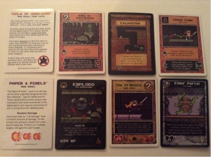 Like most games of this nature, Boss Monster is a lot more exciting with 3 or more players. The 2-Player game is certainly still enjoyable, the only complaint being that fewer cards get to be played and seen. The possibility for rivalries, alliances, and subsequent screwing over of those allies, is exponentially more exciting with additional players. I love that the game prides itself on its geekiness, throwing references mostly from video games but also extending to pop-culture, movies, Dr. Who, and other widely known sci-fi adventures. I am a pretty serious geek, gamer and collector so this game just screams for my attention with it being highly collectable (Still trying to track down a set of the original Bosses in holofoil that was only given to contributors to their Kickstarter program), and just generally showing love for all walks of gaming! This is by far my favorite table top game right now and is up there with my favorite card games of all time. Boss Monster 2 is playable on its own or can be mixed with the original Boss Monster for more possibilities. If that’s not enough both games can be combined with game-changing expansion packs such as Tools of Hero-Kind, which adds 26 additional cards and a new gameplay element called Items. Items can be taken from heroes and used against your enemies (also known as friends). Paper & Pixels is a small, 14 card expansion released as a promotional blind pack containing new room cards, heroes and even new bosses. Something about that Explodo boss card that you can’t help but smile at. I can’t wait for the next expansion: Crash Landing, which will change the rules to make the game playable for 5-6 people. But in the meantime, there are some fan made rules where both versions of the game can be used to play with up to 8 players!